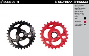 Speedfreak lánckerék: 7075-T6-os alumíniumból készült, nagyon tartós lánckerék, offset fogakkal a még jobb láncvonal érdekében. 25-ös és 28-as fogszámmal kapható, egyedi mintával, 6mm-es vastagsággal, fekete, vörös és polírozott aluszínben, 10.990Ft-os áron.